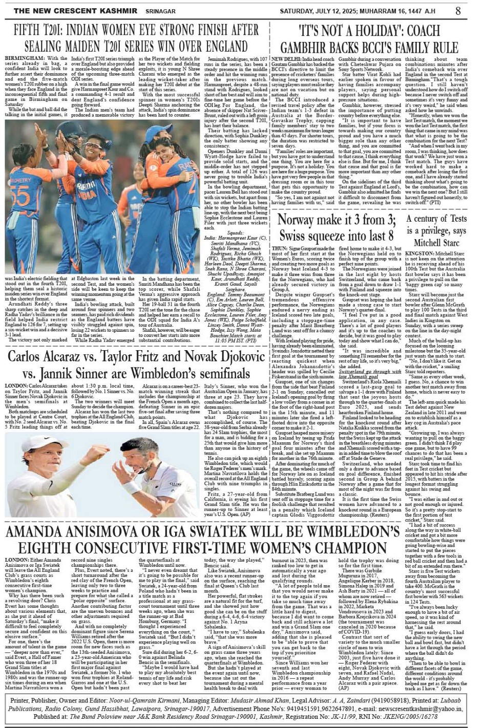 Crescent Kashmir 12-07-2025 Page: 8 July 12, 2025 << First << 8 >> Last >> Page 1Page 2Page 3Page 4Page 5Page 6Page 7Page 8 × Crescent Kashmir 12-07-2025 << First << 8 >> Last >> CK 1CK 2CK 3CK 4CK 5CK 6CK 7CK 8 CK 8