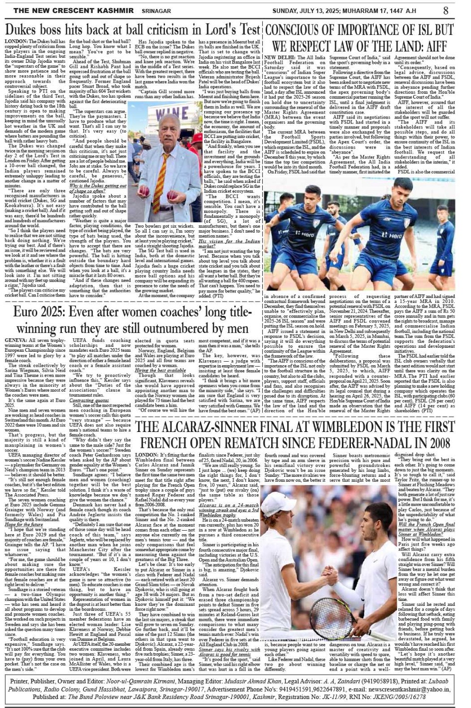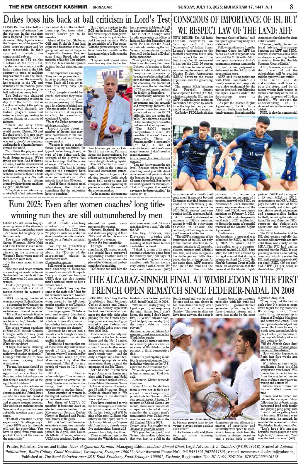 Crescent Kashmir 13-07-2025 Page: 8 July 13, 2025 << First << 8 >> Last >> Page 1Page 2Page 3Page 4Page 5Page 6Page 7Page 8 × Crescent Kashmir 13-07-2025 << First << 8 >> Last >> CK 1CK 2CK 3CK 4CK 5CK 6CK 7CK 8 CK 8