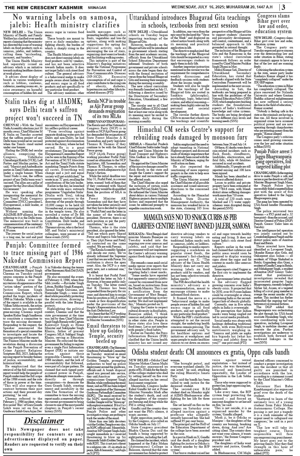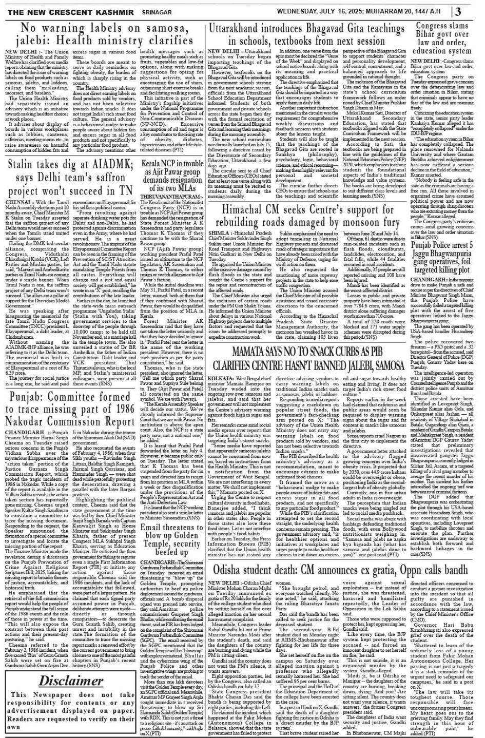 Crescent Kashmir 16-07-2025 Page: 3 July 16, 2025 << First << 3 >> Last >> Page 1Page 2Page 3Page 4Page 5Page 6Page 7Page 8 × Crescent Kashmir 16-07-2025 << First << 3 >> Last >> CK 1CK 2CK 3CK 4CK 5CK 6CK 7CK 8 CK 3