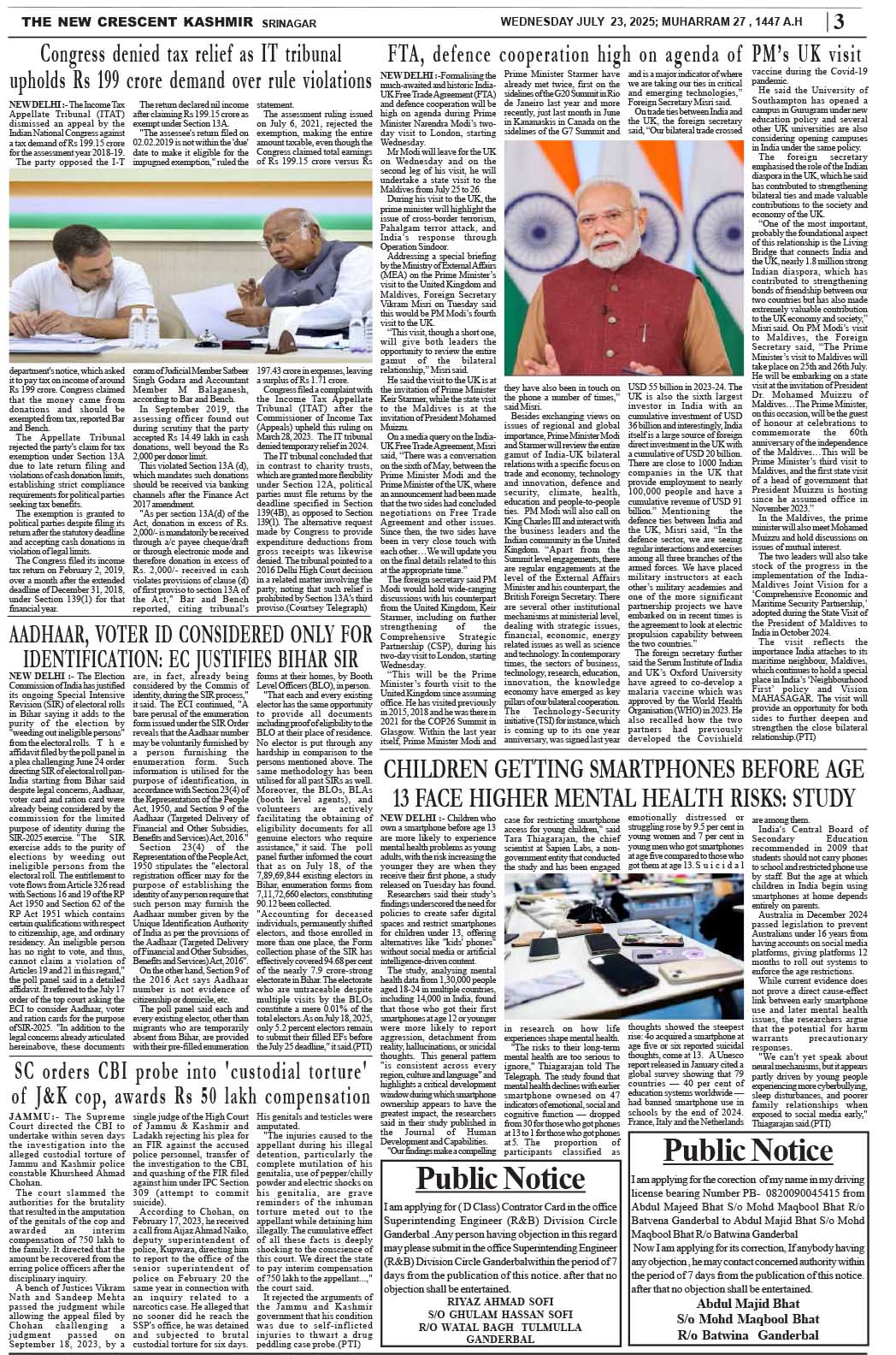 Crescent Kashmir 23-07-2025 Page: 3 July 23, 2025 << First << 3 >> Last >> Page 1Page 2Page 3Page 4Page 5Page 6Page 7Page 8 × Crescent Kashmir 23-07-2025 << First << 3 >> Last >> CK 1CK 2CK 3CK 4CK 5CK 6CK 7CK 8 CK 3
