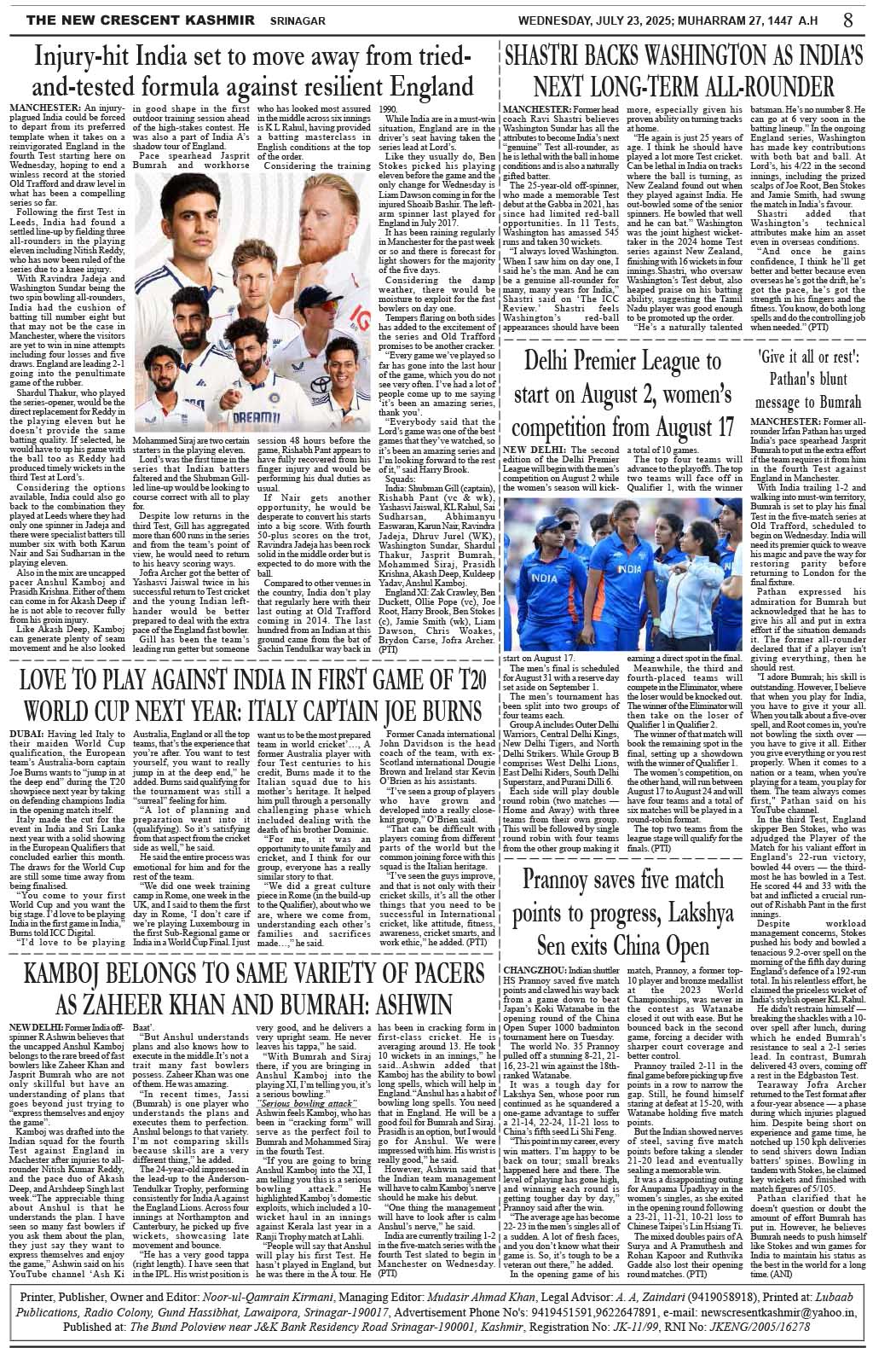 Crescent Kashmir 23-07-2025 Page: 8 July 23, 2025 << First << 8 >> Last >> Page 1Page 2Page 3Page 4Page 5Page 6Page 7Page 8 × Crescent Kashmir 23-07-2025 << First << 8 >> Last >> CK 1CK 2CK 3CK 4CK 5CK 6CK 7CK 8 CK 8