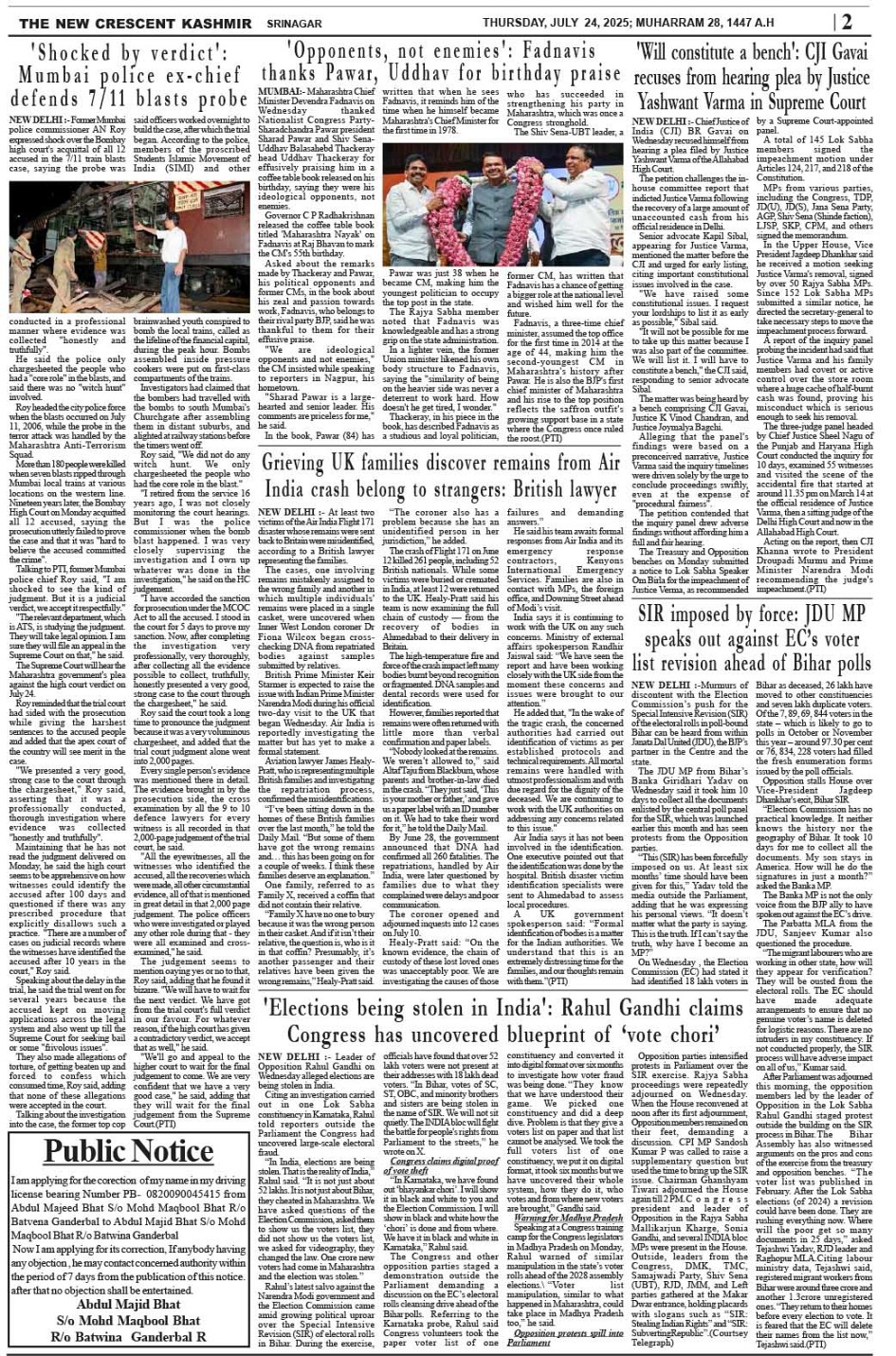 Crescent Kashmir 24-07-2025 Page: 2 July 24, 2025 << First << 2 >> Last >> Page 1Page 2Page 3Page 4Page 5Page 6Page 7Page 8 × Crescent Kashmir 24-07-2025 << First << 2 >> Last >> CK 1CK 2CK 3CK 4CK 5CK 6CK 7CK 8 CK 2