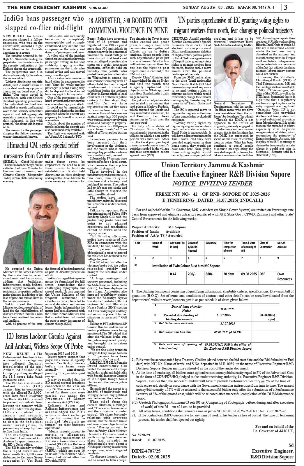 Crescent Kashmir 03-08-2025 Page: 3 August 03, 2025 << First << 3 >> Last >> Page 1Page 2Page 3Page 4Page 5Page 6Page 7Page 8 × Crescent Kashmir 03-08-2025 << First << 3 >> Last >> CK 1CK 2CK 3CK 4CK 5CK 6CK 7CK 8 CK 3