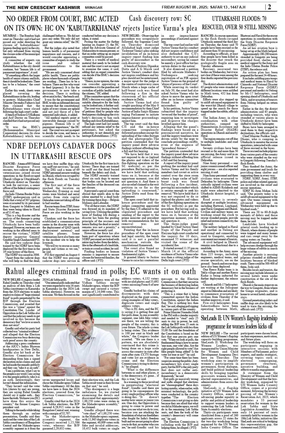 Crescent Kashmir 08-08-2025 Page: 2 August 08, 2025 << First << 2 >> Last >> Page 1Page 2Page 3Page 4Page 5Page 6Page 7Page 8 × Crescent Kashmir 08-08-2025 << First << 2 >> Last >> CK 1CK 2CK 3CK 4CK 5CK 6CK 7CK 8 CK 2
