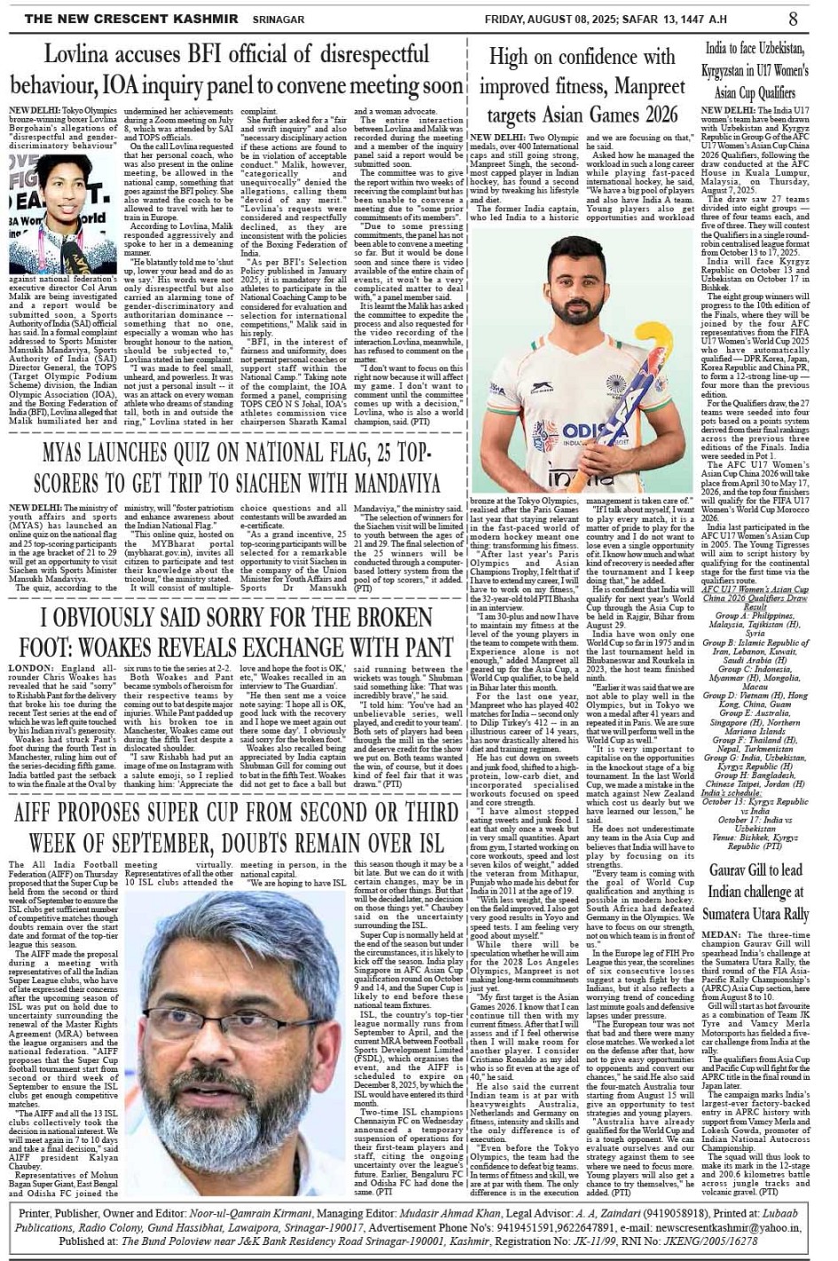 Crescent Kashmir 08-08-2025 Page: 8 August 08, 2025 << First << 8 >> Last >> Page 1Page 2Page 3Page 4Page 5Page 6Page 7Page 8 × Crescent Kashmir 08-08-2025 << First << 8 >> Last >> CK 1CK 2CK 3CK 4CK 5CK 6CK 7CK 8 CK 8